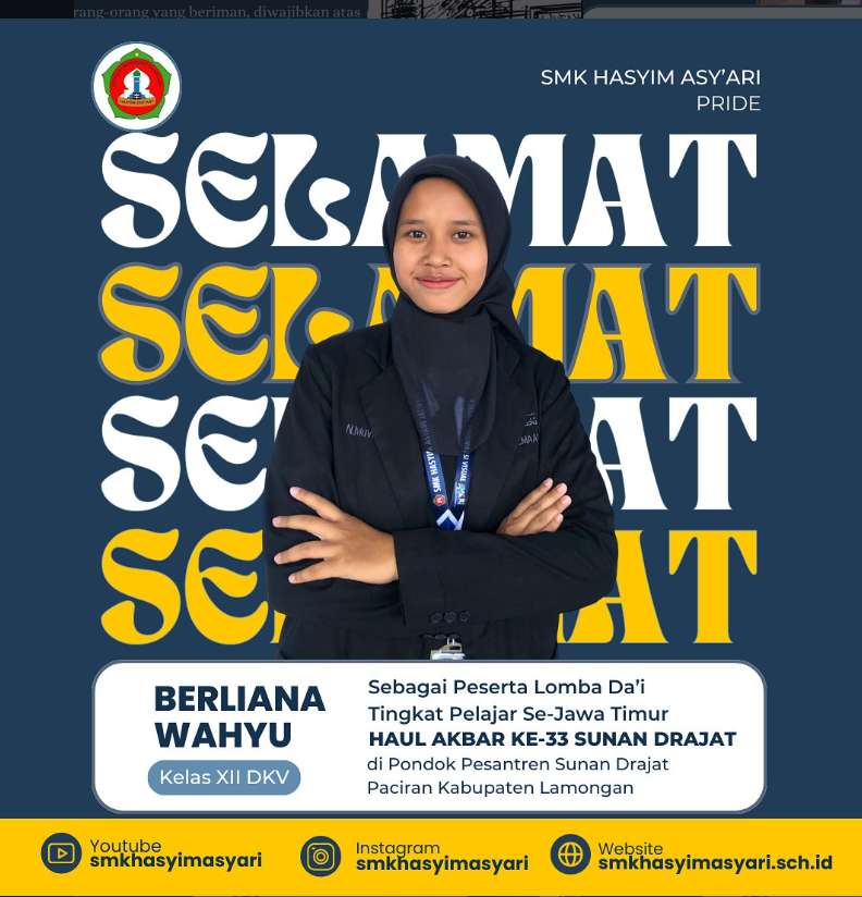 SMK Hasyim Asy’ari kembali menunjukkan eksistensinya dalam mencetak generasi pelajar yang berprestasi dan berakhlak. Salah satu siswinya, Berliana Wahyu, siswi kelas XII DKV, turut berpartisipasi sebagai peserta Lomba Da’i Tingkat Pelajar se-Jawa Timur dalam rangkaian acara Haul Akbar ke-33 Sunan Drajat. Kegiatan bergengsi tersebut diselenggarakan di Pondok Pesantren Sunan Drajat, Paciran, Kabupaten Lamongan, dan diikuti […]