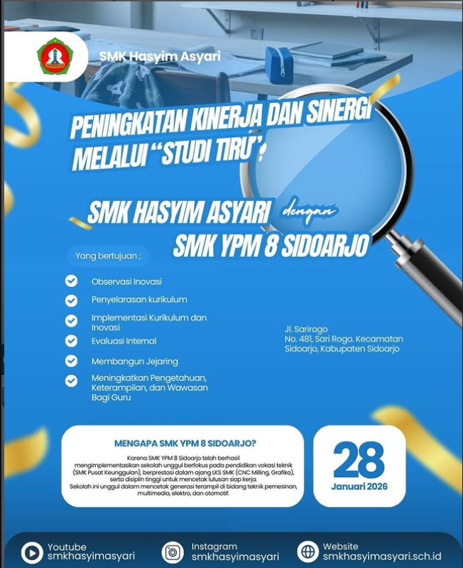 Sidoarjo, 28 Januari 2026 — Dalam upaya meningkatkan kualitas pendidikan serta memperkuat sinergi antarlembaga, SMK Hasyim Asy’ari melaksanakan kegiatan Studi Tiru ke SMK YPM 8 Sidoarjo. Kegiatan ini menjadi bagian dari strategi pengembangan mutu sekolah, khususnya dalam bidang inovasi pembelajaran dan penyelarasan kurikulum. Studi tiru ini bertujuan untuk melakukan observasi inovasi, penyelarasan kurikulum, serta implementasi […]