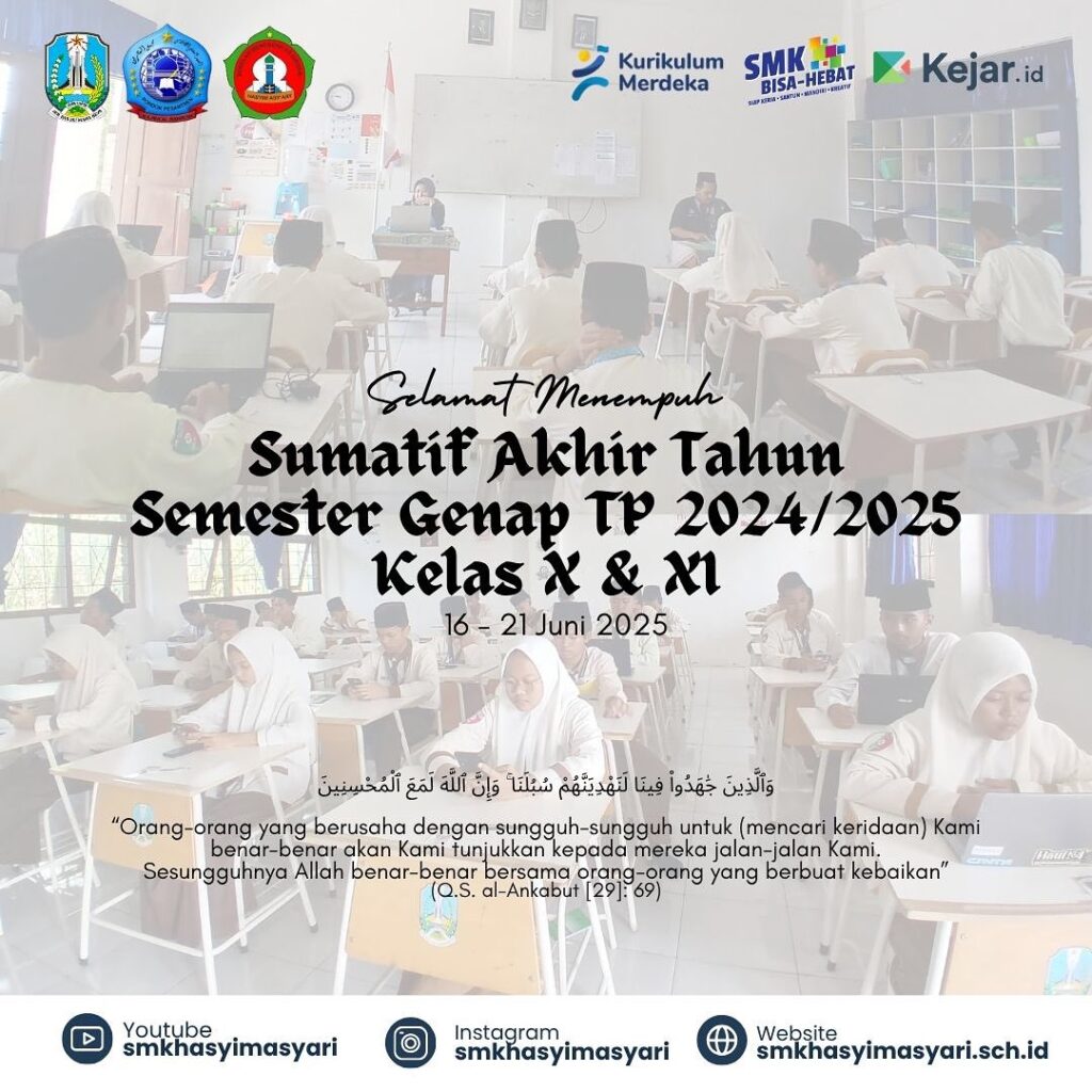 Selamat menempuh Sumatif Akhir Tahun (SAT) Semester Genap TP 2024/2025 bagi Kelas X dan XI. Semoga diberikan kelancaran saat mengerjakan dan mendapatkan nilai yang memuaskan✨. Terus belajar, tetap semangat, dan jaga kesehatan yaa !! SMK BISA, SMK HEBAT, SMK HASYIM ASY’ARI LUAR BIASA