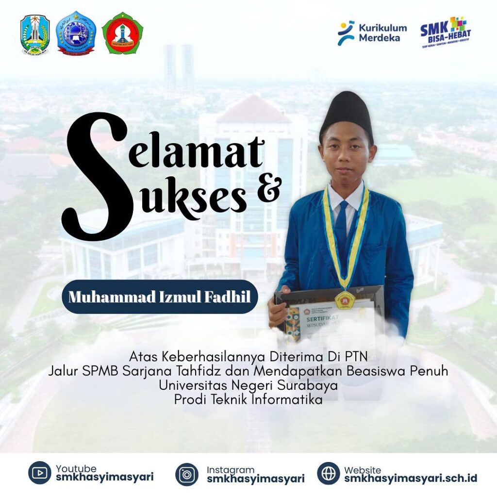 Alhamdulillah.. Siswa Alumni SMK Hasyim Asy’ari TP 2023/2024 yakni Ananda Muhammad Izmul Fadhil dari Kelas DKV berhasil lolos SPMB Sarjana Tahfidz dan Mendapatkan Beasiswa Penuh di Universitas Negeri Surabaya dengan Prodi Teknik Informatika. Selamat atas keberhasilan yang telah diraih dan Sukses untuk mewujudkan mimpi-mimpi di Universitas impian